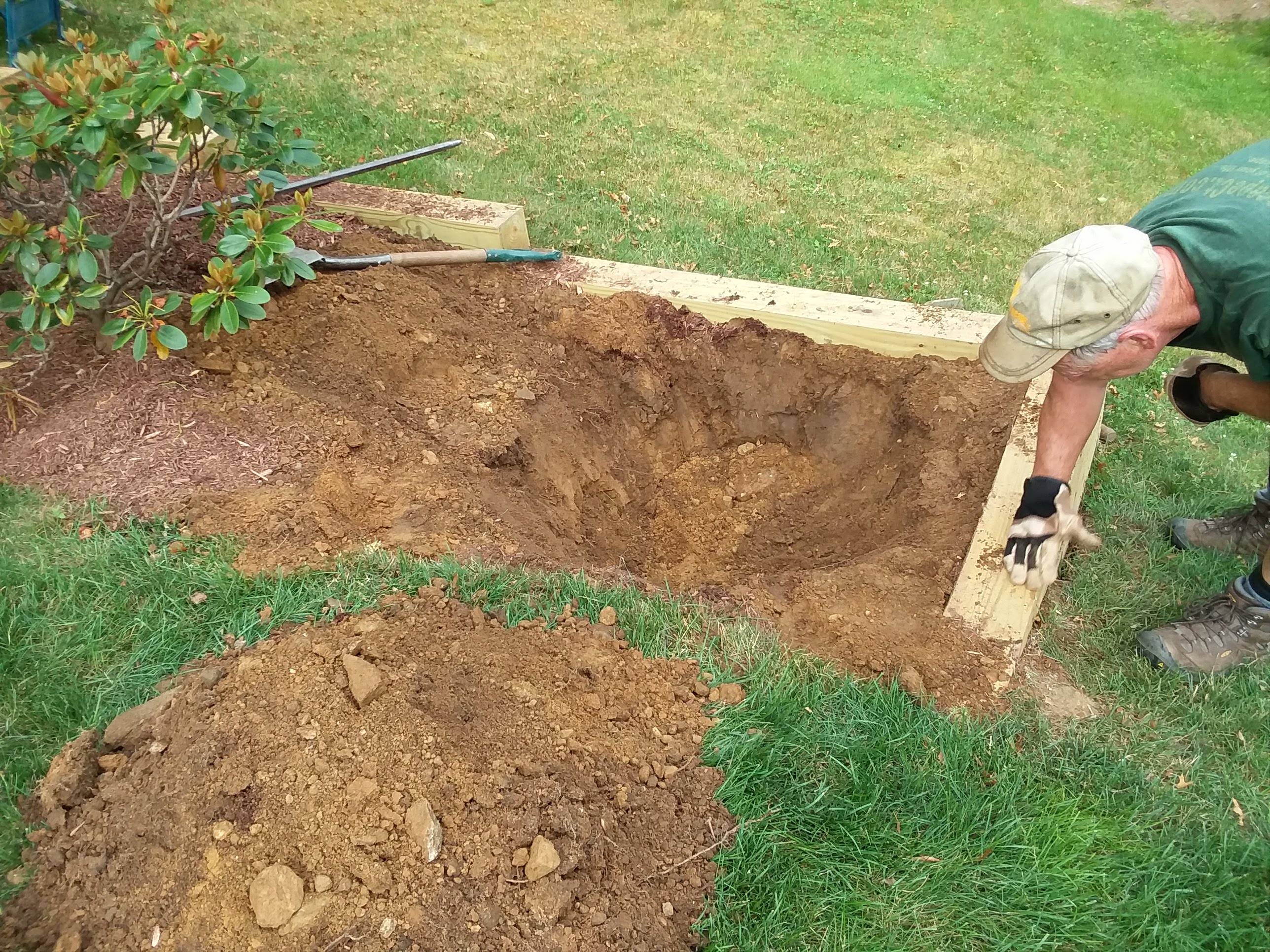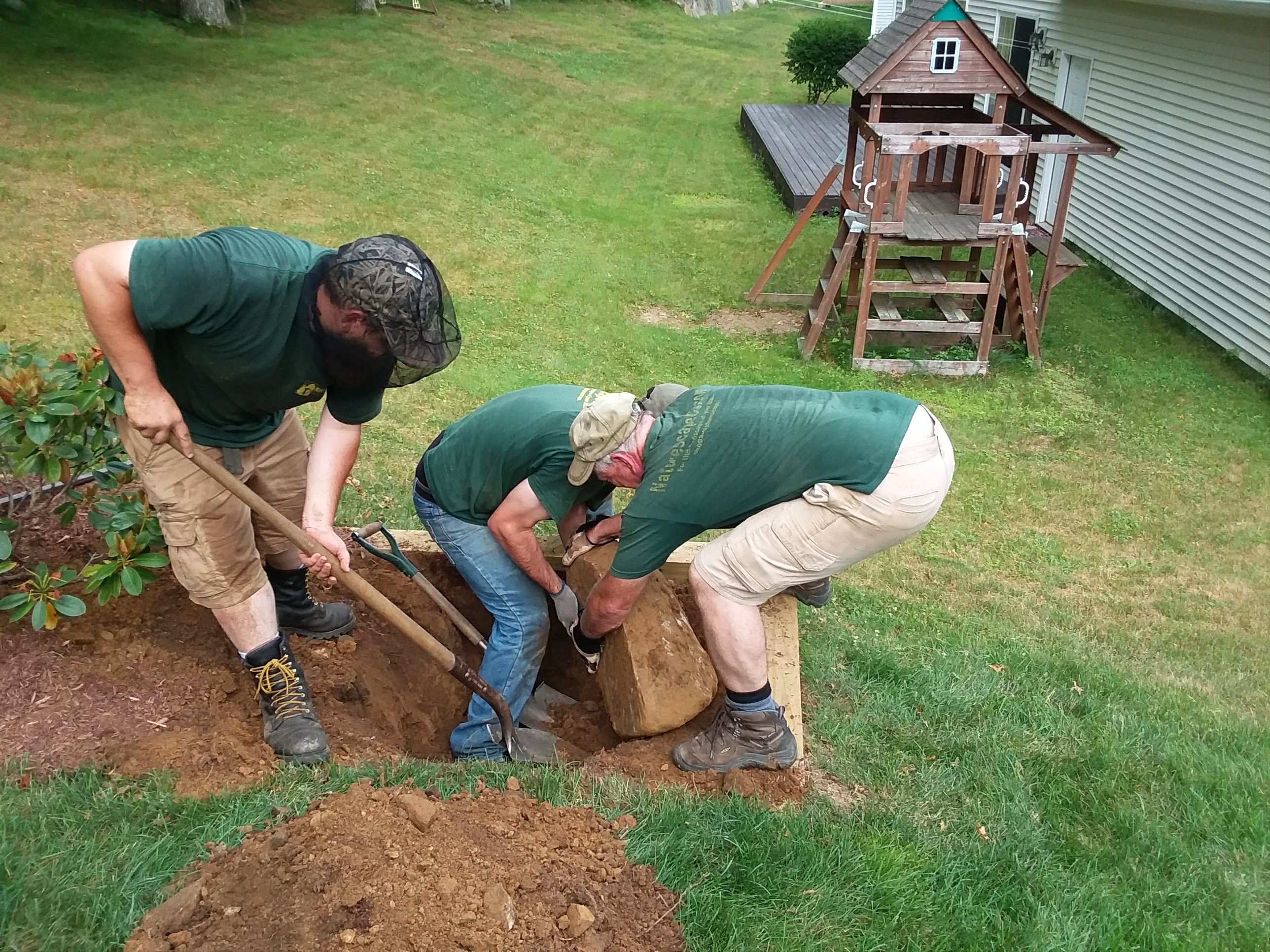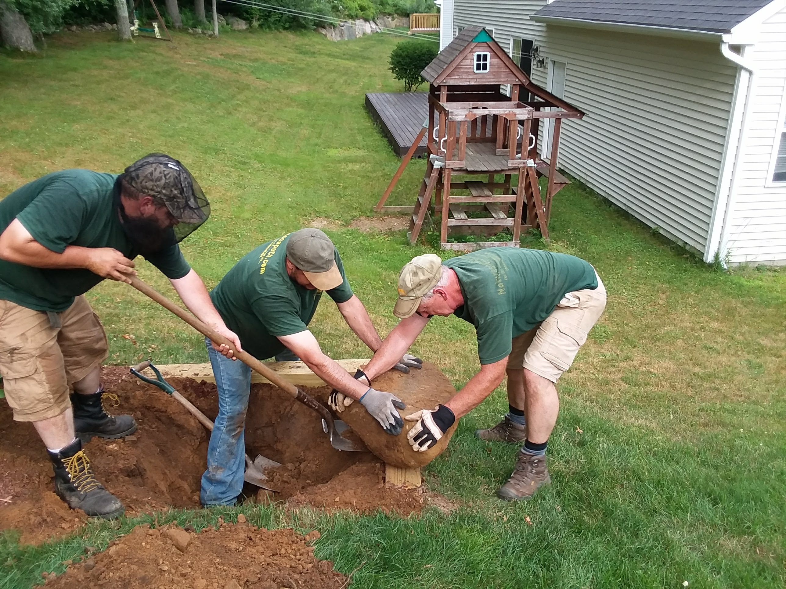 Check out 2 of our team projects below. We had to work together to remove this stump and stubborn rock! We had a large stump that we pulled out with the excavator and it needed to go into the woods across the lawn. We couldn’t go across the lawn because of the septic so the only option was to have the guys carry it down. They jokingly said we’ll use 2 wheelbarrows next to each other. They frequently do things like this. That’s our team!